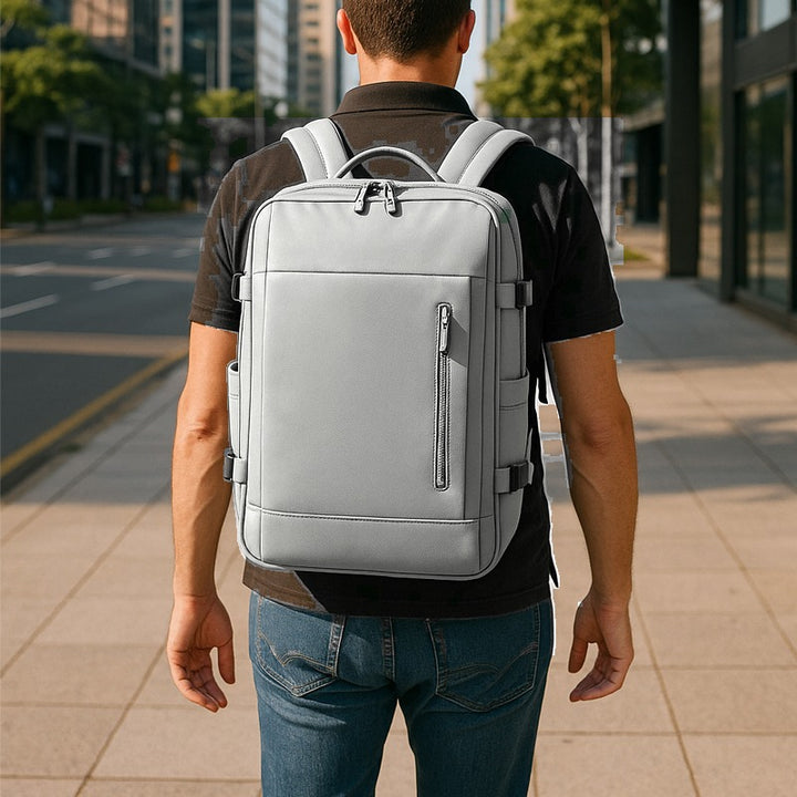 Design moderno e minimalista: grande capacidade (20–35 L), tecido Oxford resistente à água, compartimento para notebook e porta USB pass-through para usar com power bank.