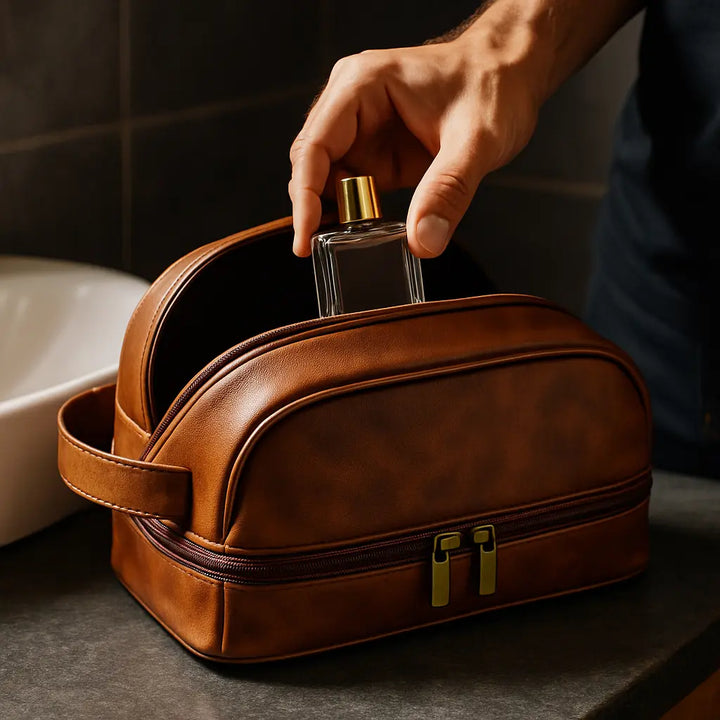 Couro legítimo, design moderno e capacidade extra para manter higiene, barbear e cosméticos protegidos e organizados em qualquer ocasião.